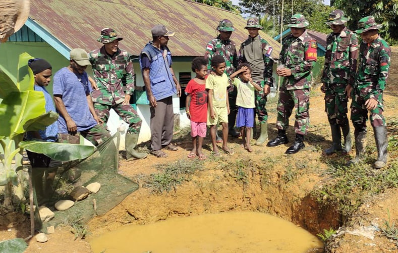 Keerom ~ Dalam rangka pemberdayaan wilayah di Perbatasan Papua, Satgas Pamtas Statis RI-PNG Yonif 310/KK Pos Unggalom mengundang masyarakat dan mengajarkan cara budidaya ikan lele dengan memanfaatkan media yang ada di Kampung Unggalom Distrik Web Kabupaten Keerom, Papua, Rabu (30/8/2023).