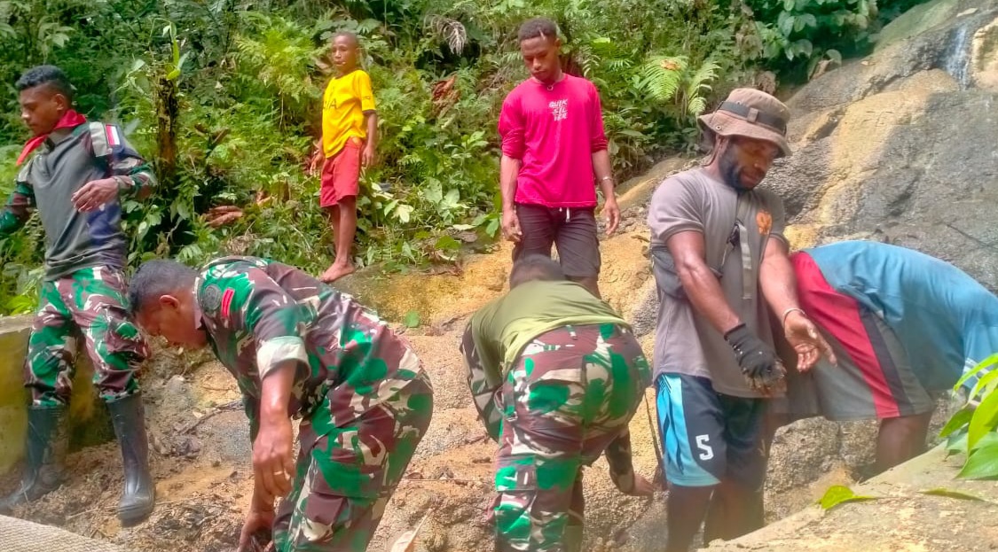 Keerom, – Dalam rangka memenuhi kebutuhan air bersih, Satgas Yonif 310/KK bersama warga perbatasan alirkan kembali mata air yang tersumbat di Kampung Ubrub Distrik Web Kabupaten Keerom, Papua, Rabu (23/8/2023).