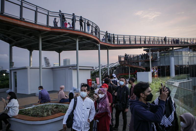 Pengunjung melihat pemandangan dari Skywalk Senayan Park, Kawasan tersebut menjadi salah satu objek wisata ibu kota yang ramai dikunjungi oleh warga dengan menyajikan pemandangan lanskap perkotaan.