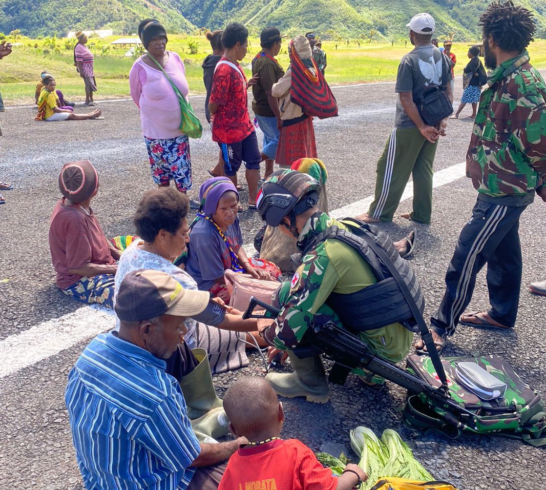 Pegunungan Bintang ~ Satgas Pamtas Statis Yonif 310/KK lakukan Komunikasi Sosial dengan warga untuk ciptakan rasa aman di Kp. Oknanggul Distrik Kiwirok Kab. Pegunungan Bintang, Papua Pegunungan, Jumat (11/8/2023)