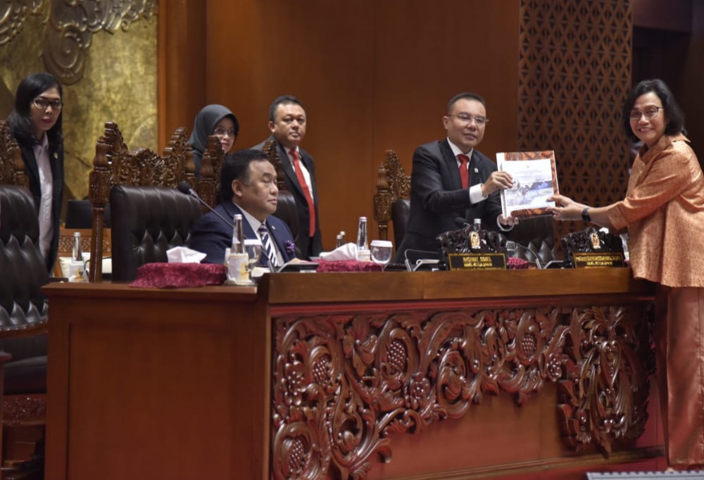 Menteri Keuangan (Menkeu) Sri Mulyani saat menyerahkan pandangan kepada Wakil Ketua DPR RI Sufmi Dasco Ahmad, terkait Penyampaian Pemerintah terhadap Kerangka Ekonomi Makro dan Pokok-Pokok Kebijakan Fiskal (KEM dan PPKF) Rancangan Anggaran Pendapatan dan Belanja Negara (RAPBN) Tahun Anggaran 2025 di Rapat Paripurna, Senin (20/5/2024). (Foto: Dok DPR RI)