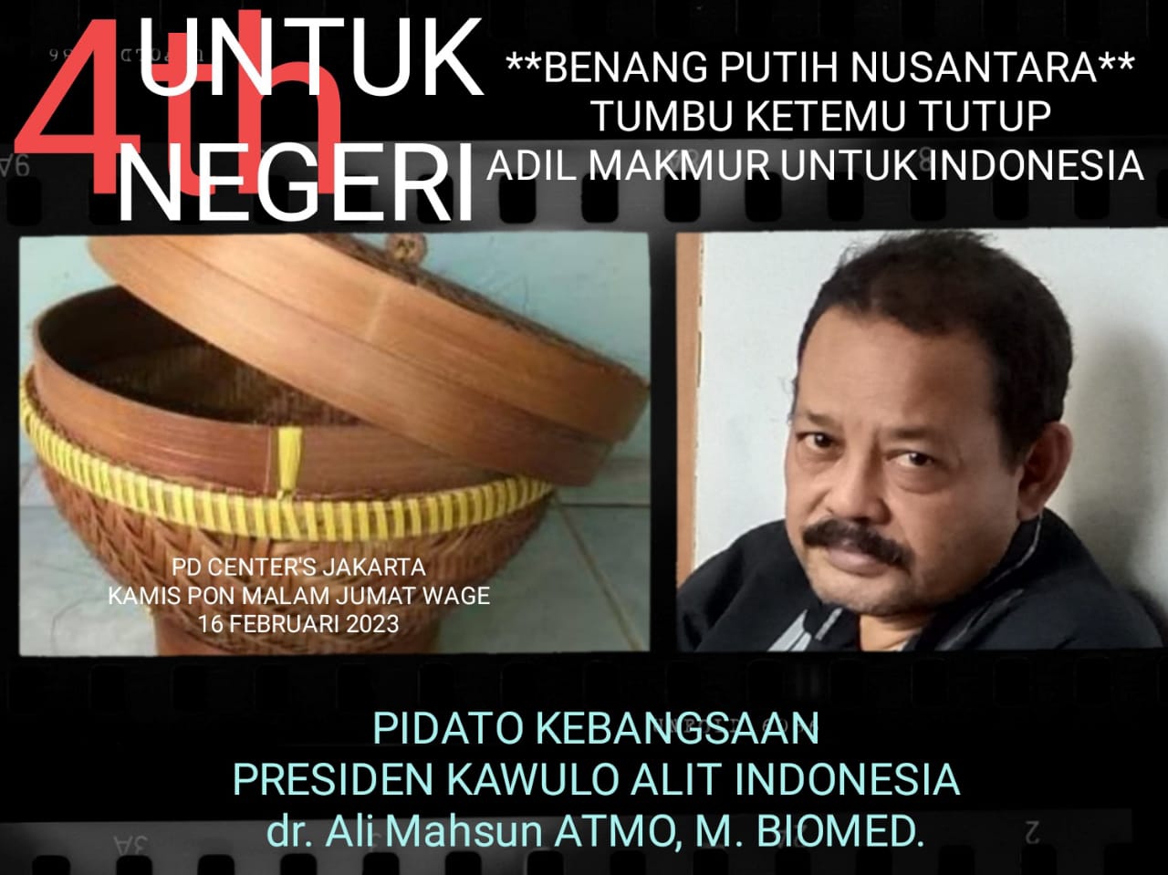Untuk menjawab hal tersebut, Presiden Kawulo Alit Indonesia, dr. Ali Mahsun ATMO, M. BIOMED. yang juga Ketua Umum APKLI PERJUANGAN dan Ketua Umum KERIS (Komite Ekonomi Rakyat Indonesia) pada hari Kamis Pon Malam Jum’at Wage tanggal 16 Februari 2023 di PG CENTER’S JAKARTA akan menyampaikan pandangan obyektif dan subyektif yang dimiliki yang merupakan pentautan antara pengalaman dan pembelajaran hidup khususnya dalam kurun waktu 4 tahun dari 24 Januari 2019 hingga 24 Januar 2023. Yaitu Pidato Kebangsaan Presiden Kawulo Alit Indonesia bertajuk: “4th Untuk Negeri: Benang Putih Nusantara Tumbu Ketemu TUTUP Adil dan Makmur Untuk Indonesia”.