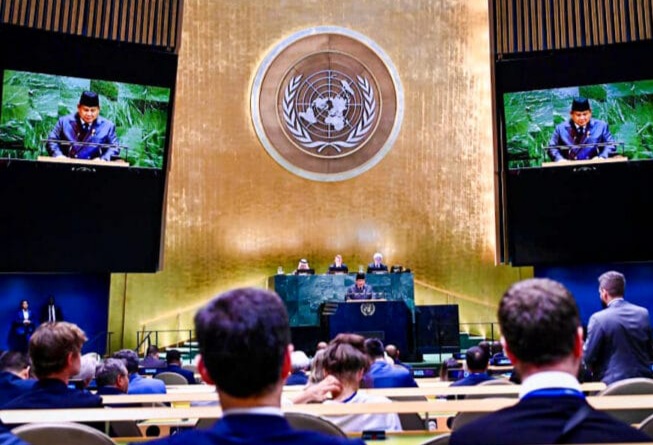 JAKARTA – Presiden Republik Indonesia, Prabowo Subianto menyampaikan pidato Konferensi Internasional Tingkat Tinggi untuk Penyelesaian Damai atas Masalah Palestina dan Implementasi Solusi Dua Negara yang digelar di Gedung Majelis Umum Perserikatan Bangsa-Bangsa (PBB), New York, Amerika Serikat, pada Senin, 22 September 2025. (Foto: BPMI Setpres)