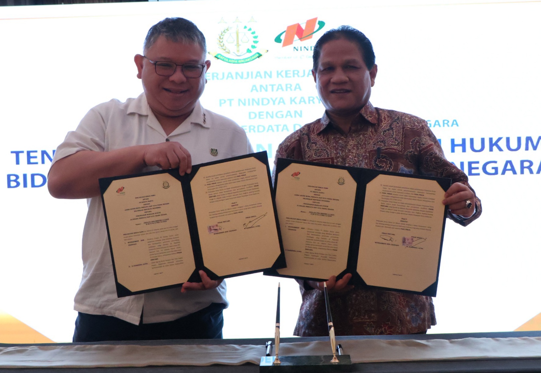 Penandatanganan perjanjian dilakukan di Hotel Gran Mahakam, Jakarta Selatan, oleh Dr. R. Narendra Jatna, S.H., LL.M., selaku Jaksa Agung Muda Perdata dan Tata Usaha Negara (JAM-Datun) dan Moeharmein Zein Chaniago, Direktur Utama PT Nindya Karya.