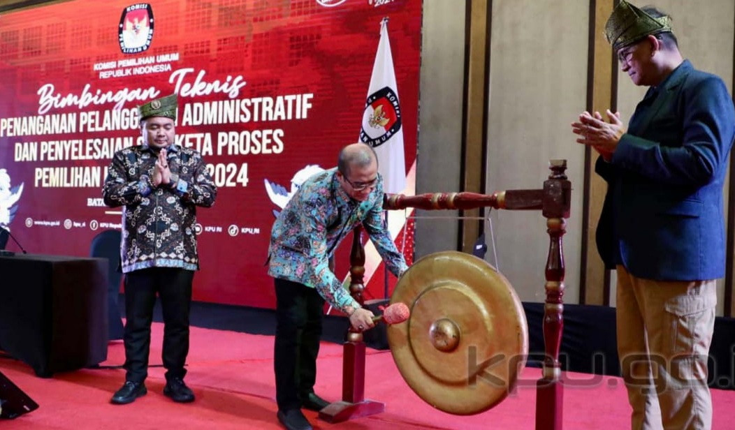 Batam – Ketua KPU Hasyim Asy’ari dan Anggota KPU Mochammad Afifuddin didampingi Deputi Bidang Dukungan Teknis Eberta Kawima secara resmi membuka kegiatan Bimbingan Teknis Penanganan Pelanggaran Administratif dan Penyelesaian Sengketa Proses Pemilihan Umum Tahun 2024 di Batam, Selasa (4/4/2023).