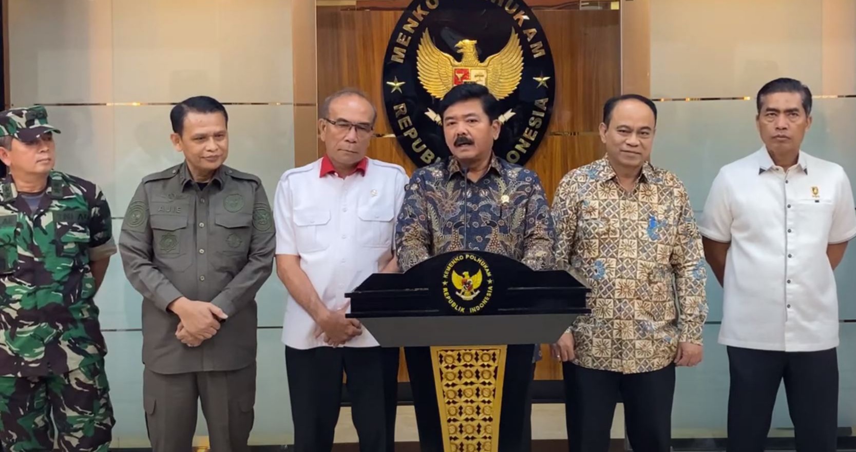 Menko Polhukam Hadi Tjahjanto memberikan keterangan pers usai rapat koordinasi terkait pengamanan di bidang informasi dan komunikasi pascapemungutan suara Pemilihan Umum (Pemilu) Tahun 2024, di Kantor Kementerian Koordinator Bidang Polhukam, Jakarta, Selasa (19/03/2024). (Sumber: Tangkapan Layar)