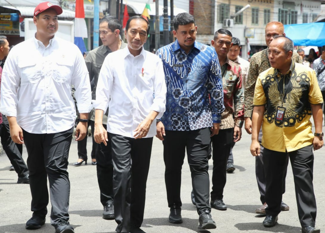 Presiden Jokowi berkunjung ke pasar sukaramai usai membuka Muktamar Ikatan Pelajar Muhammadiyah (IPM) XXIII Tahun 2023. Presiden, Menpora Dito dan Wali Kota Medan Bobby Nasution tampak berkeliling di area pasar.