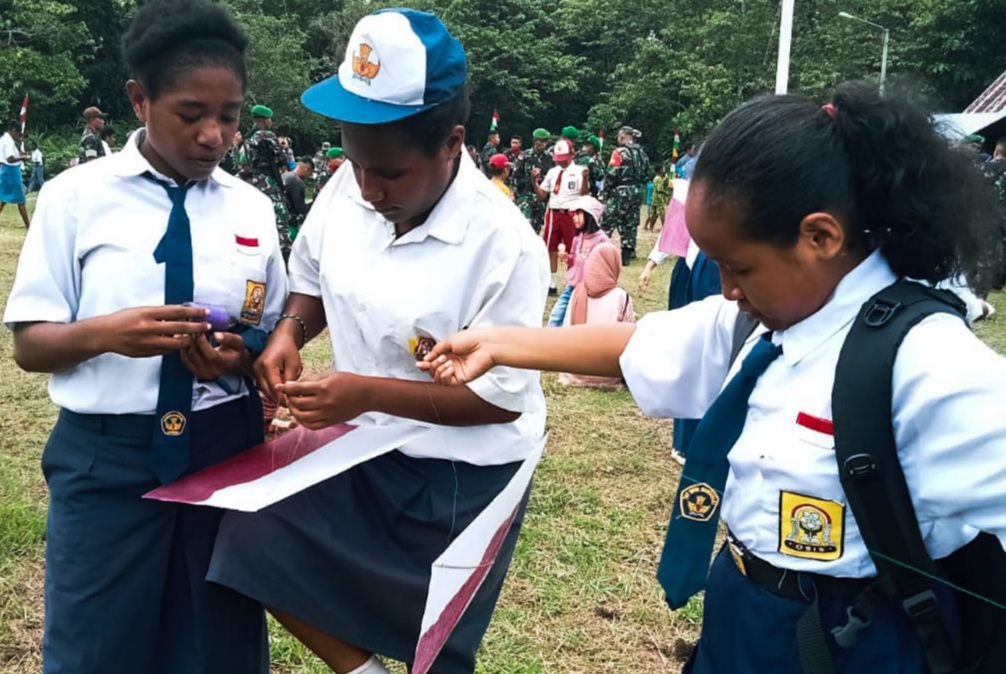 Keerom ~ Memperingati HUT RI ke 78, Satgas Yonif 310/KK bersama warga perbatasan menerbangkan 1000 layang-layang bernuansa merah putih, di Distrik Senggi Kabupaten Keerom, Papua, Kamis (17/8/2023).
