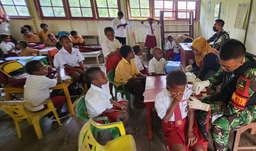 Keerom ~ Dalam rangka Bulan Imunisasi Anak Sekolah (BIAS), Satgas Yonif 310/KK laksanakan Imunisasi pada siswa SD Inpres Yabanda di Kampung Yabanda Distrik Yaffi Kabupaten Keerom, Papua, Kamis (7/9/2023)
