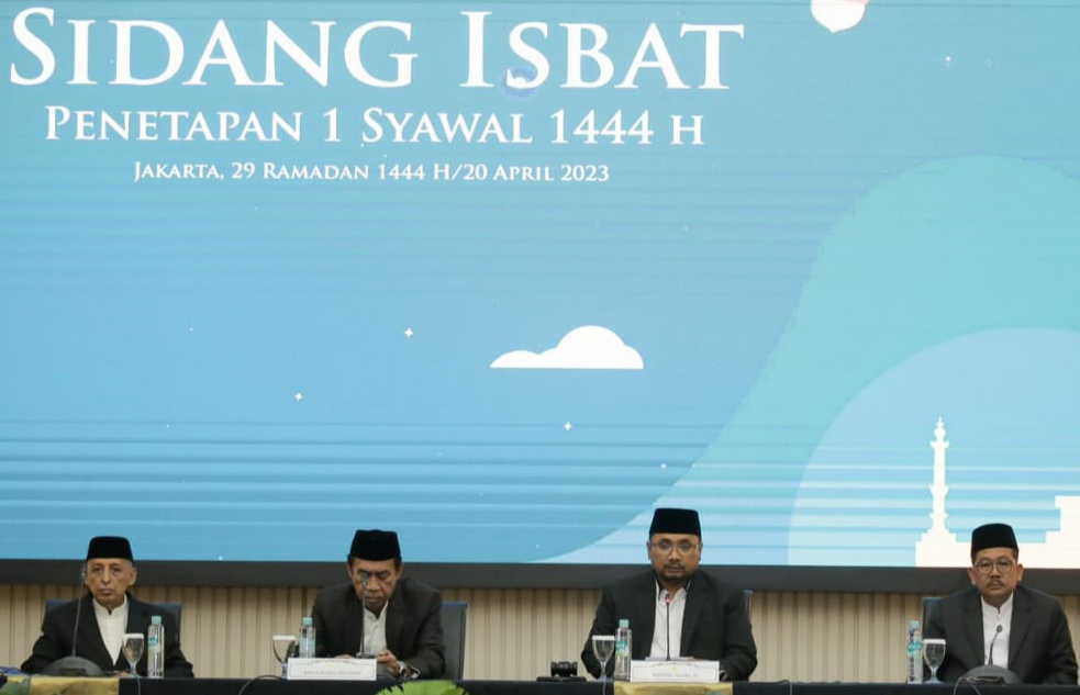 “Sidang isbat secara bulat menetapkan 1 Syawal 1444 H jatuh pada hari Sabtu, 22 April 2023,” ujar Menag dalam konferensi pers yang digelar usai Sidang Isbat 1 Syawal 1444H.