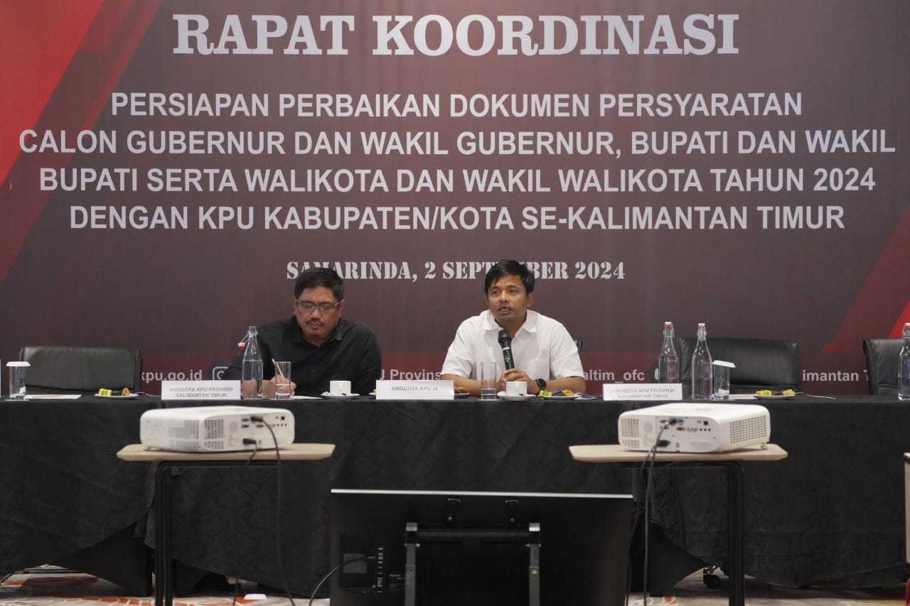 KALTIM, – Anggota KPU Idham Holik hadir dan memberi pengarahan pada Rapat Koordinasi Persiapan Perbaikan Dokumen Persyaratan Calon Gubernur dan Wakil Gubernur, Bupati dan Wakil Bupati serta Walikota dan Wakil Walikota Tahun 2024 dengan KPU Kabupaten/Kota se-Kalimantan Timur, di Samarinda, Senin (2/9/2024).