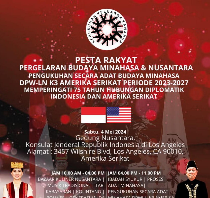 JAKARTA, – Tahun ini genap 75 tahun hubungan diplomatik antara Republik Indonesia (RI) dengan Amerika Serikat (AS). Momentum tersebut menjadi inspirasi diadakannya pengukuhan Dewan Pengurus Wilayah Kerukunan Keluarga Kawanua (K3) Amerika Serikat yang dilakukan secara adat di Konsulat Jenderal Republik Indonesia (KJRI) Los Angeles pada Sabtu, 4 Mei 2024.